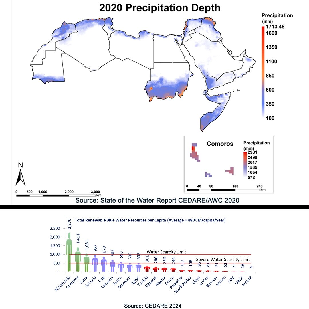 يشير التقرير إلى عدم توزيع متوازن للأمطار في العالم العربي، حيث تتركز في المناطق الجبلية، بينما تعاني المناطق الصحراوية وشبه الصحراوية من ندرة شديدة، مما يؤثر بشكل مباشر على تدفق المياه السطحية وتشكّل الأنهار.