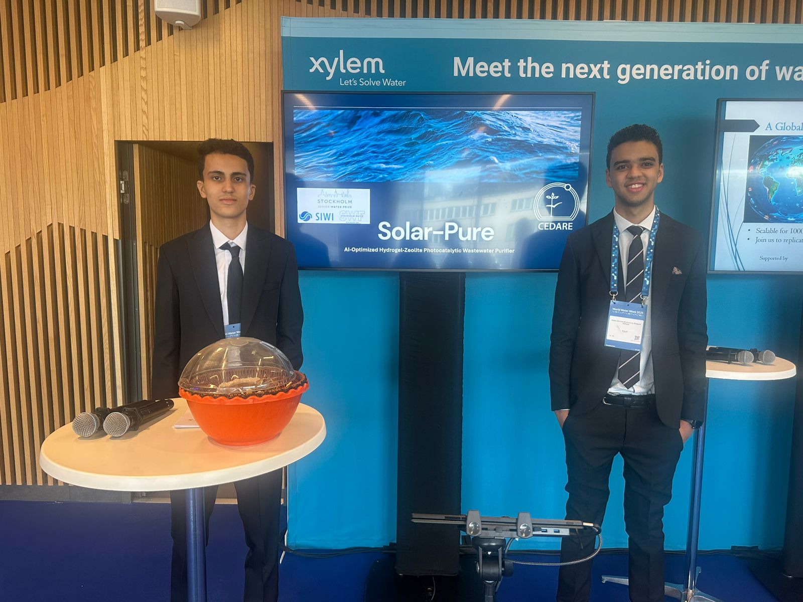 ومن خلال برنامج جائزة ستوكهولم للمياه للشباب – مصر (SJWP-Egypt)، دعم سيداري الطالبين آدم أحمد الحسيني سلامة وأحمد حسني الديب في تطوير مشروعهما المبتكر: منقّي المياه الهجين بالهيدروجيل والزيوليت والتحفيز الضوئي المعزز بالذكاء الاصطناعي. وهو نظام منخفض التكلفة يعمل بالطاقة الشمسية، ويجمع بين التحلية بالهيدروجيل، والامتصاص بالزيوليت، والتحفيز الضوئي لتوفير مياه نظيفة في المناطق محدودة الموارد.