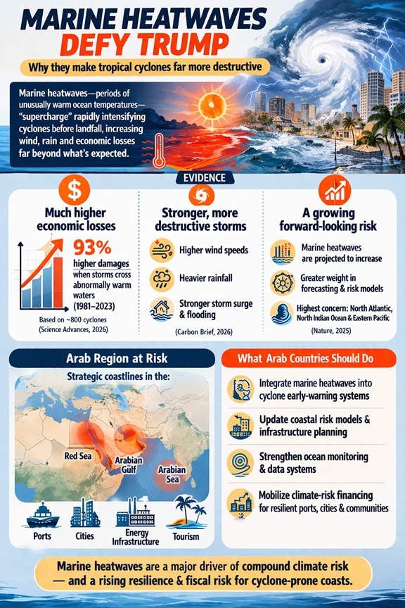 في تحدٍ لموقف ترامب القائم على “عدم الحديث عن المناخ” (الغارديان، 2026)، برز فهم جديد ومهم بشأن المخاطر المناخية البحرية. فموجات الحر البحرية تُعد اليوم عاملًا أساسيًا يزيد من قوة الأعاصير المدارية سريعة الاشتداد، لأنها تجعلها أشد من حيث سرعة الرياح، وغزارة الأمطار، وحجم الخسائر الاقتصادية، أكثر مما كان متوقعًا سابقًا (كاربون بريف، 2026). ويتضح ذلك من خلال ما يلي: