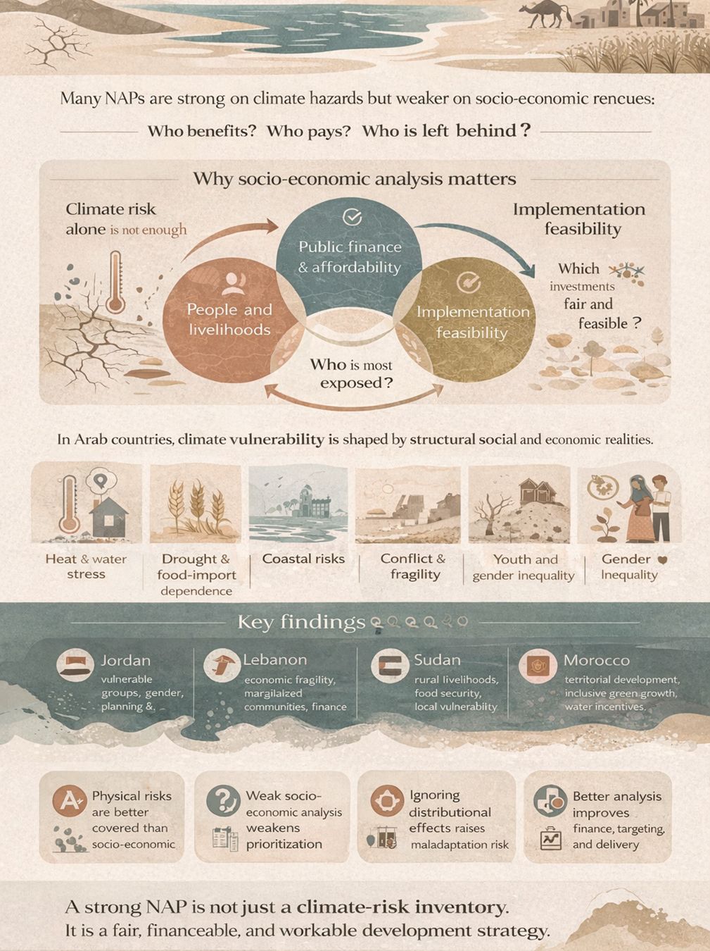 Core Thesis: National Adaptation Plans are most useful not when they only describe climate hazards, but when they show how adaptation choices affect people, livelihoods, inequality, fiscal space, and implementation feasibility. In Arab countries especially, socio-economic analysis is what turns adaptation from a risk inventory into a workable development strategy.