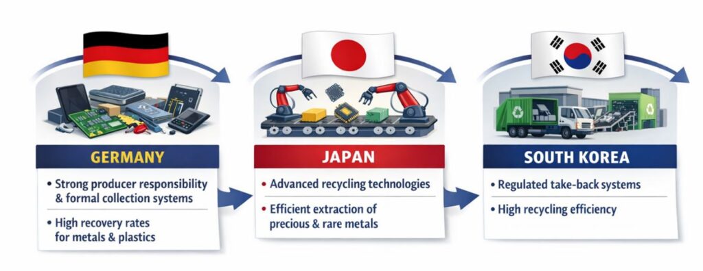 In contrast, countries with structured collection networks, such as Germany and South Korea, demonstrate how formalized take-back systems can ensure high recovery rates and proper handling of hazardous components.