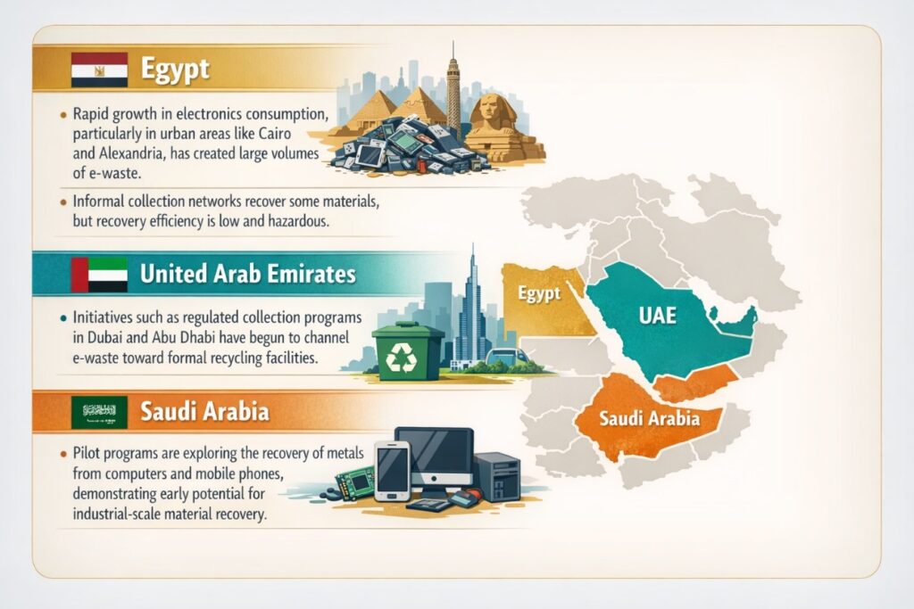 This trend is becoming increasingly visible across the Arab region. Countries such as Egypt, the United Arab Emirates, Saudi Arabia, and Morocco have experienced steady growth in the use of electronic devices, particularly smartphones, personal computers, and small household electronics. Expanding digital infrastructure, the growth of online services, and rising demand for consumer electronics have all contributed to higher levels of electronic consumption. However, systems for managing discarded electronic products remain limited in many cases. In Egypt and Jordan, a large share of e-waste is still collected through informal channels, while in several other countries in the region formal recycling capacity is still at an early stage of development.