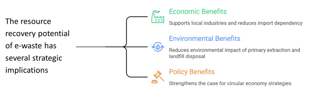 Overall, the resource embedded in e-waste presents both an opportunity and a challenge. The opportunity lies in converting discarded products into a reliable supply of secondary raw materials, while the challenge lies in building the infrastructure, governance, and incentives necessary to unlock this potential.