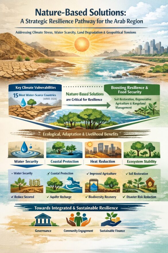 The Arab region, the arena of the Iran war, is entering a period of intensifying climate stress marked by worsening water scarcity, land degradation, extreme heat, coastal risks, and growing pressure on food and urban systems. This is further exacerbated by growing geopolitical and socio-economic stresses. In this context, Nature-Based Solutions are critically important for climate resilience in the Arab region because they are not merely environmental interventions, but a practical and strategic approach that addresses the ecological root causes of vulnerability and food security while strengthening adaptation, livelihoods, and long-term socio-economic stability. This is evidenced by: